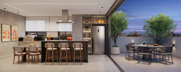 Espaço gourmet com dois ambientes (interno e externo) no rooftop